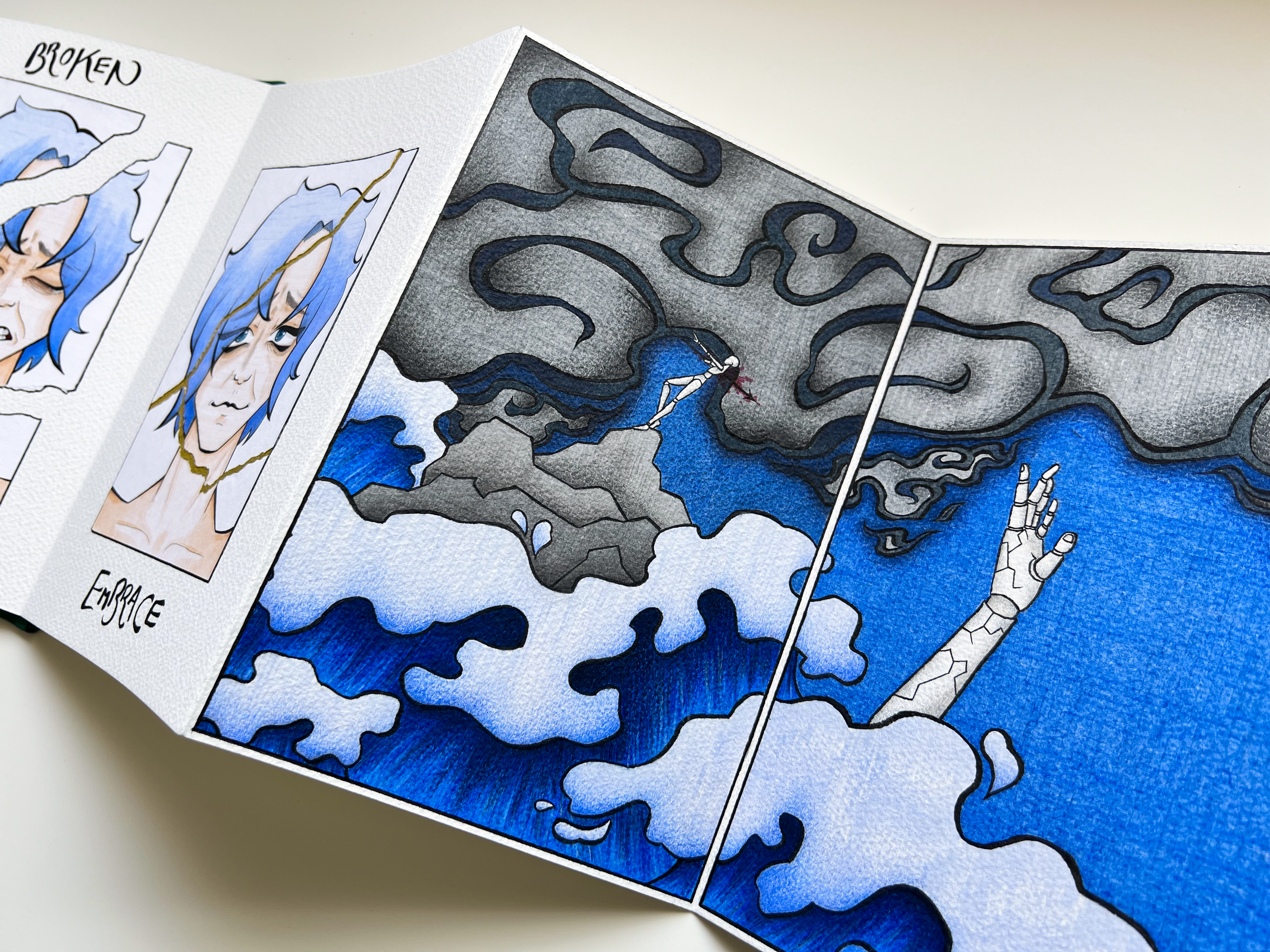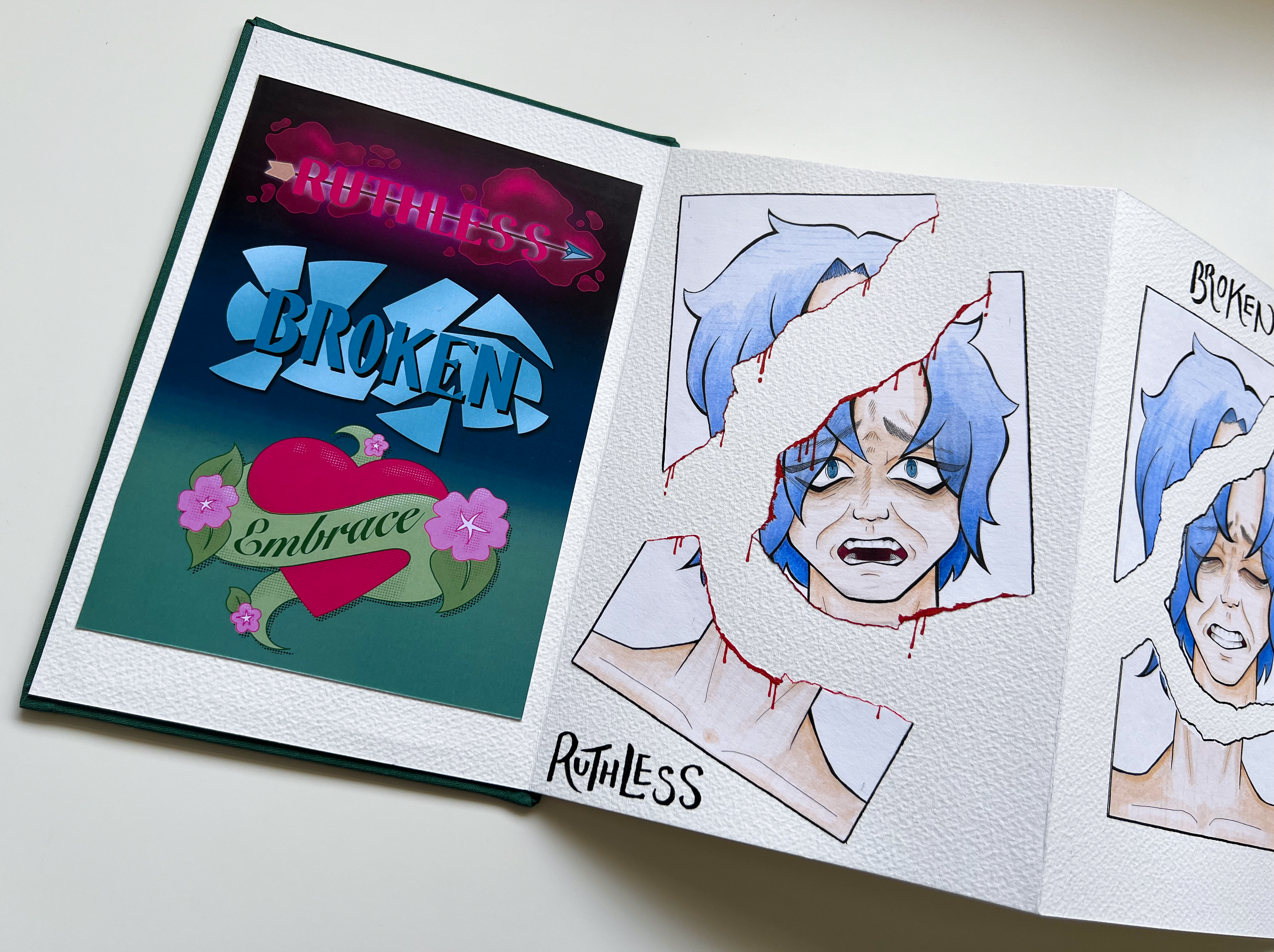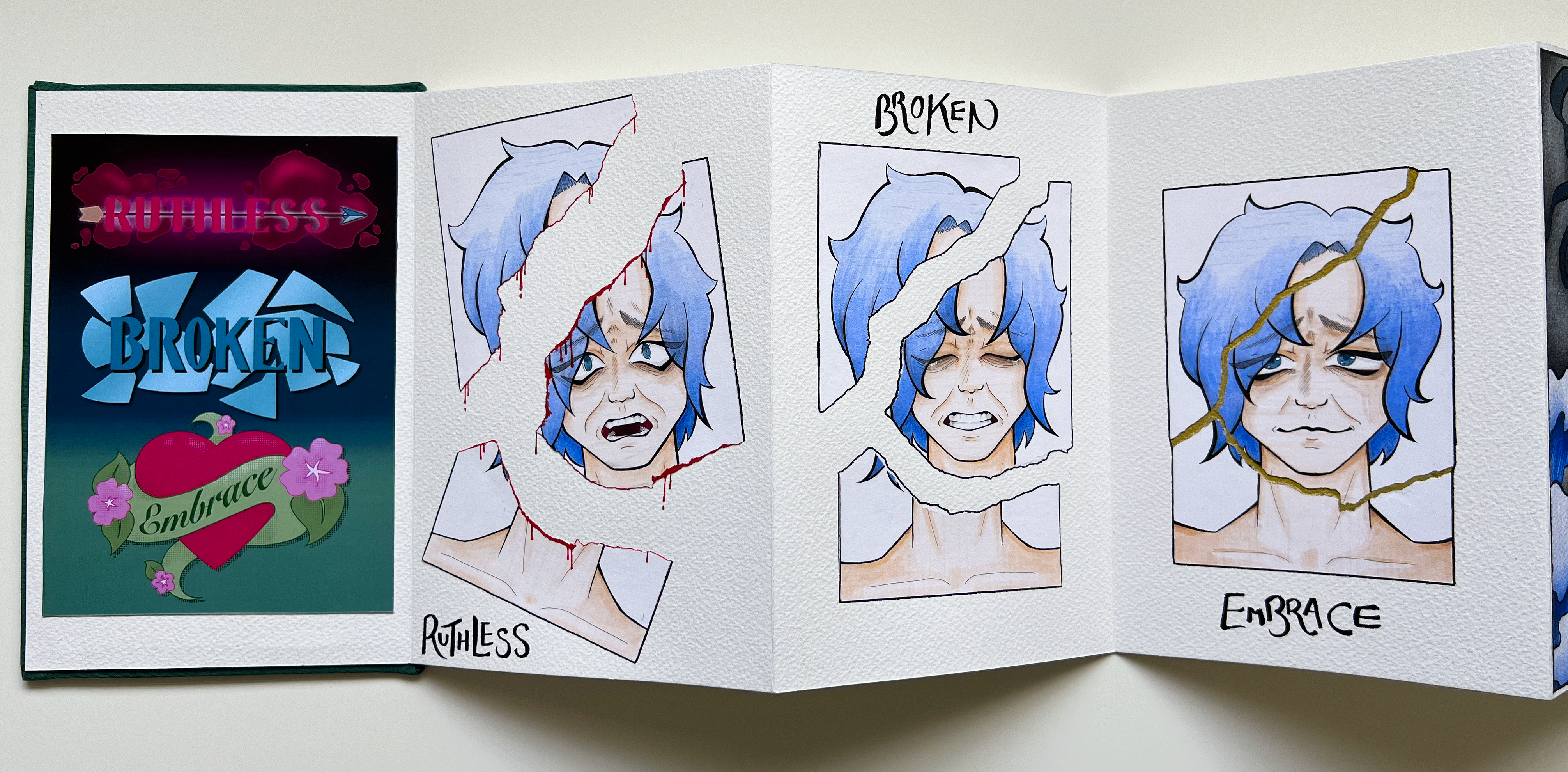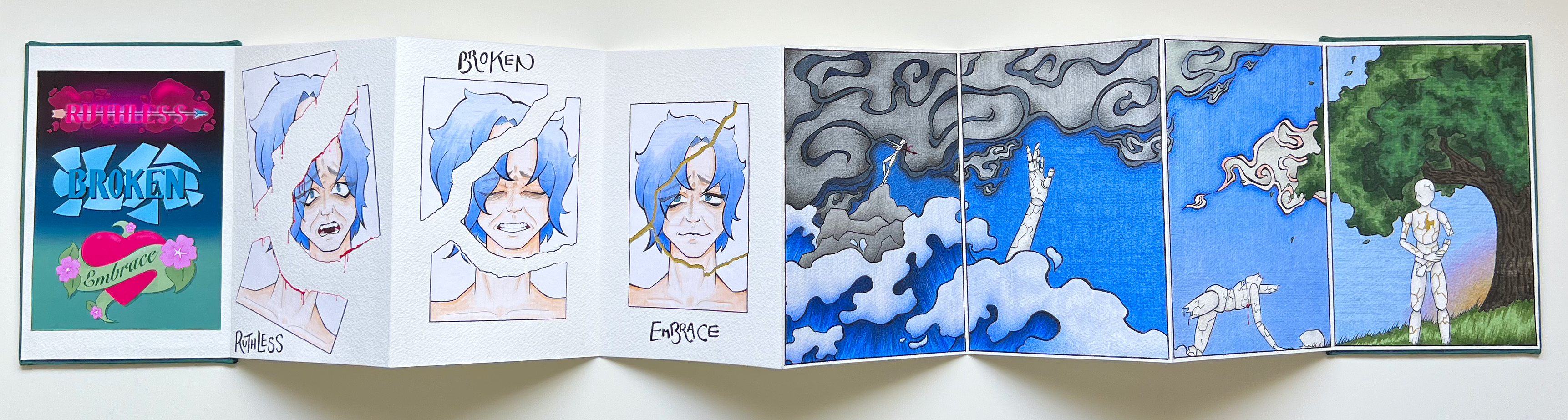 A collection of narrative illustrations based around the words Ruthless, Broken and Embrace. I wanted to try doing something that was a bit deeper than a comic, and tackle something that was more abstract than I am used to doing. So I chose some evocative words that I felt had a relationship, and spun a narrative around them in a concertina book.