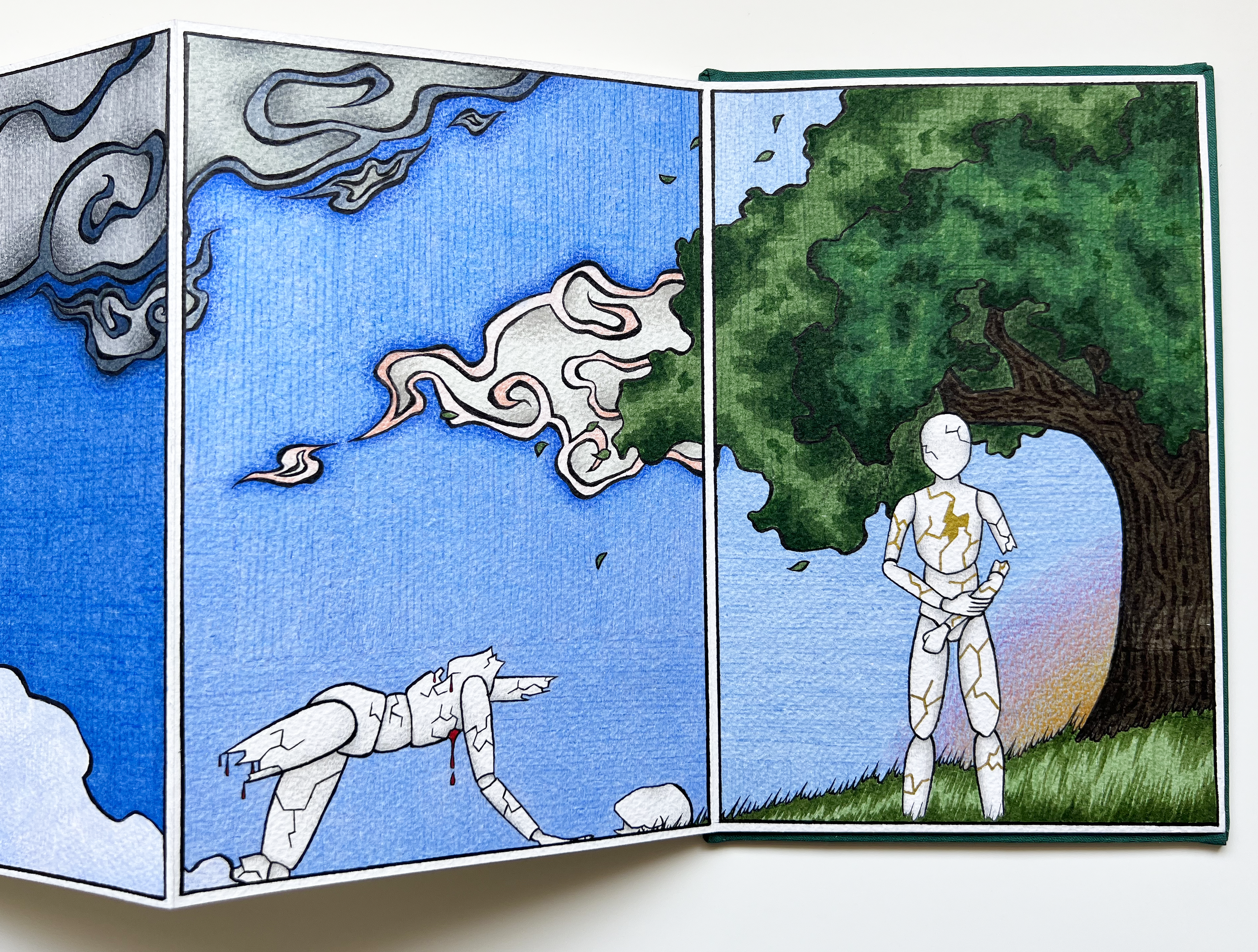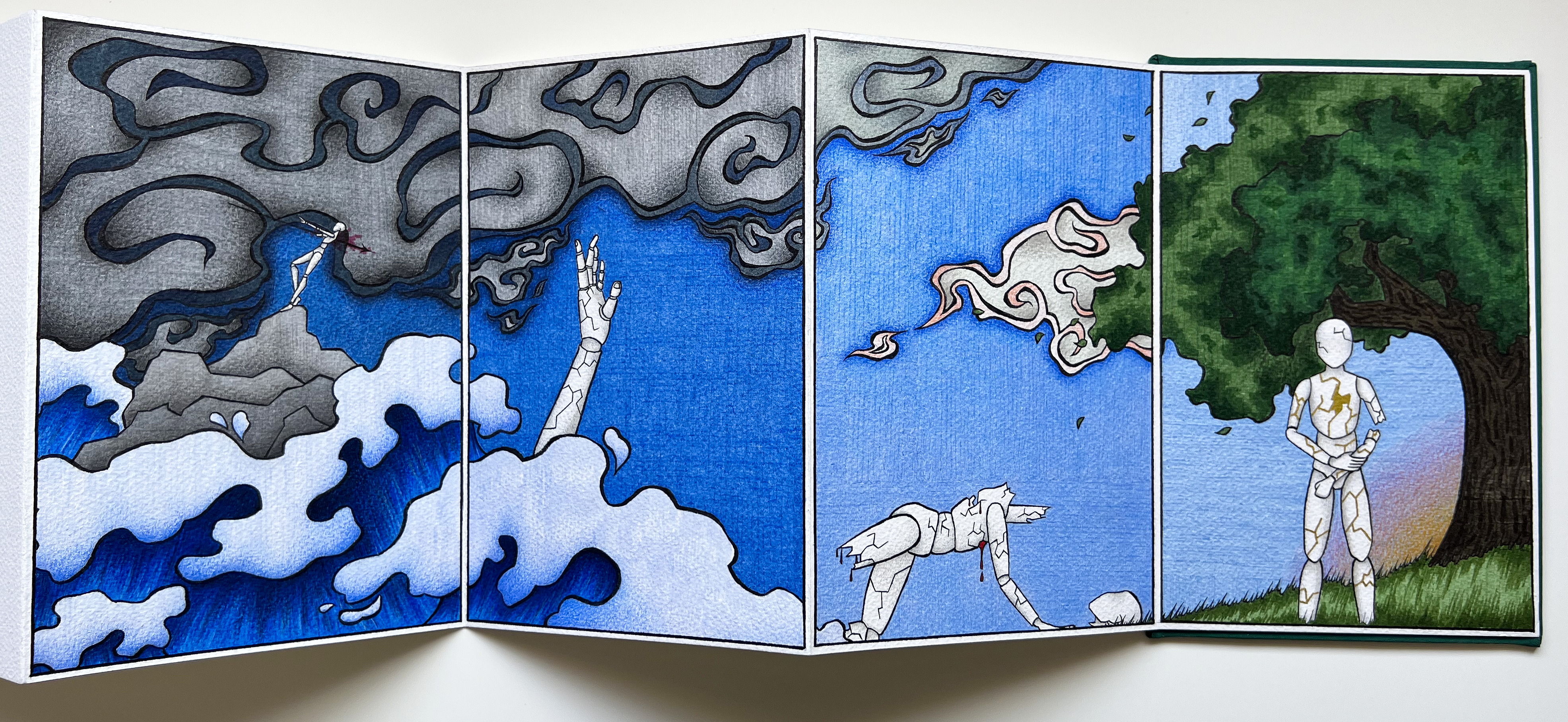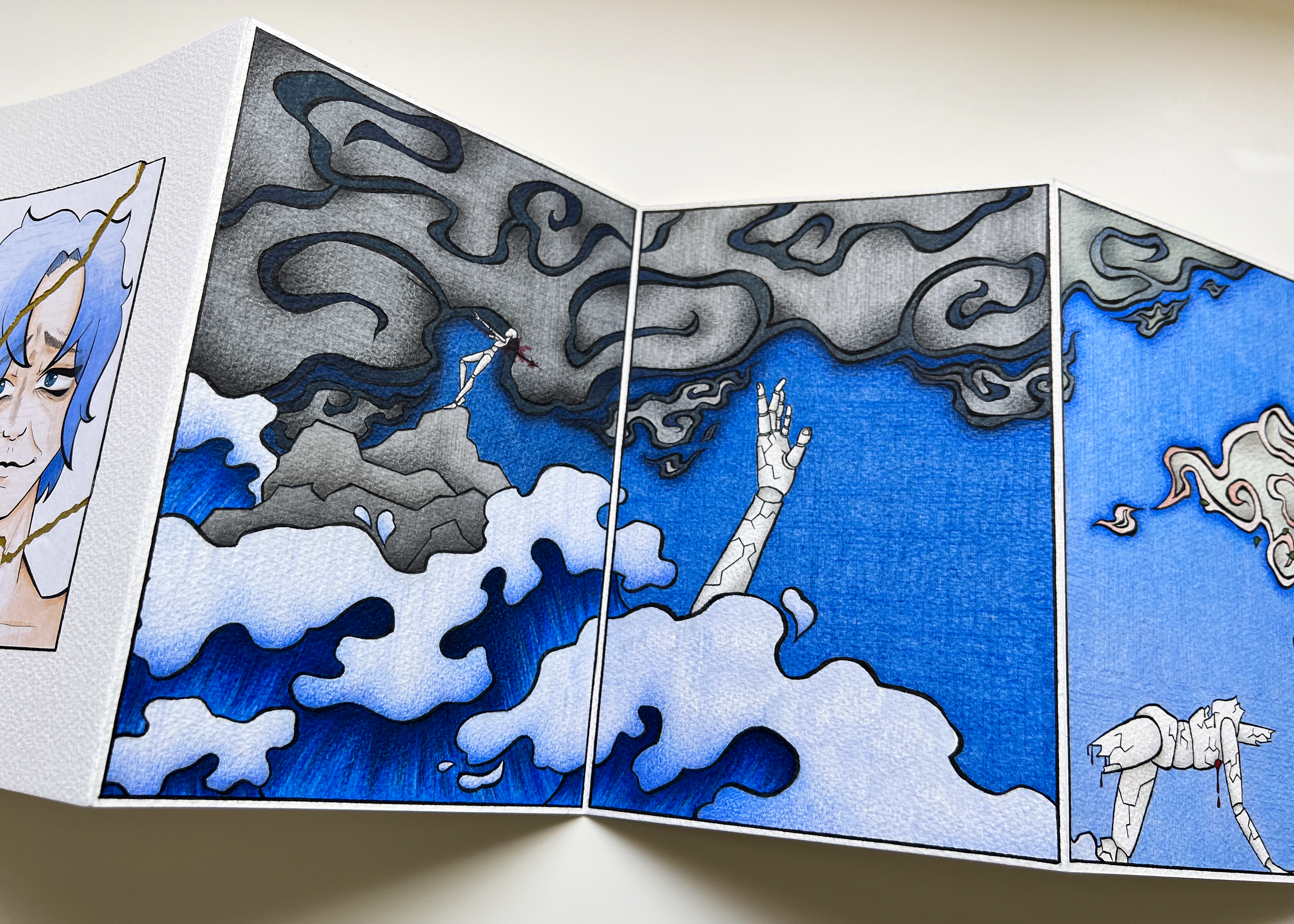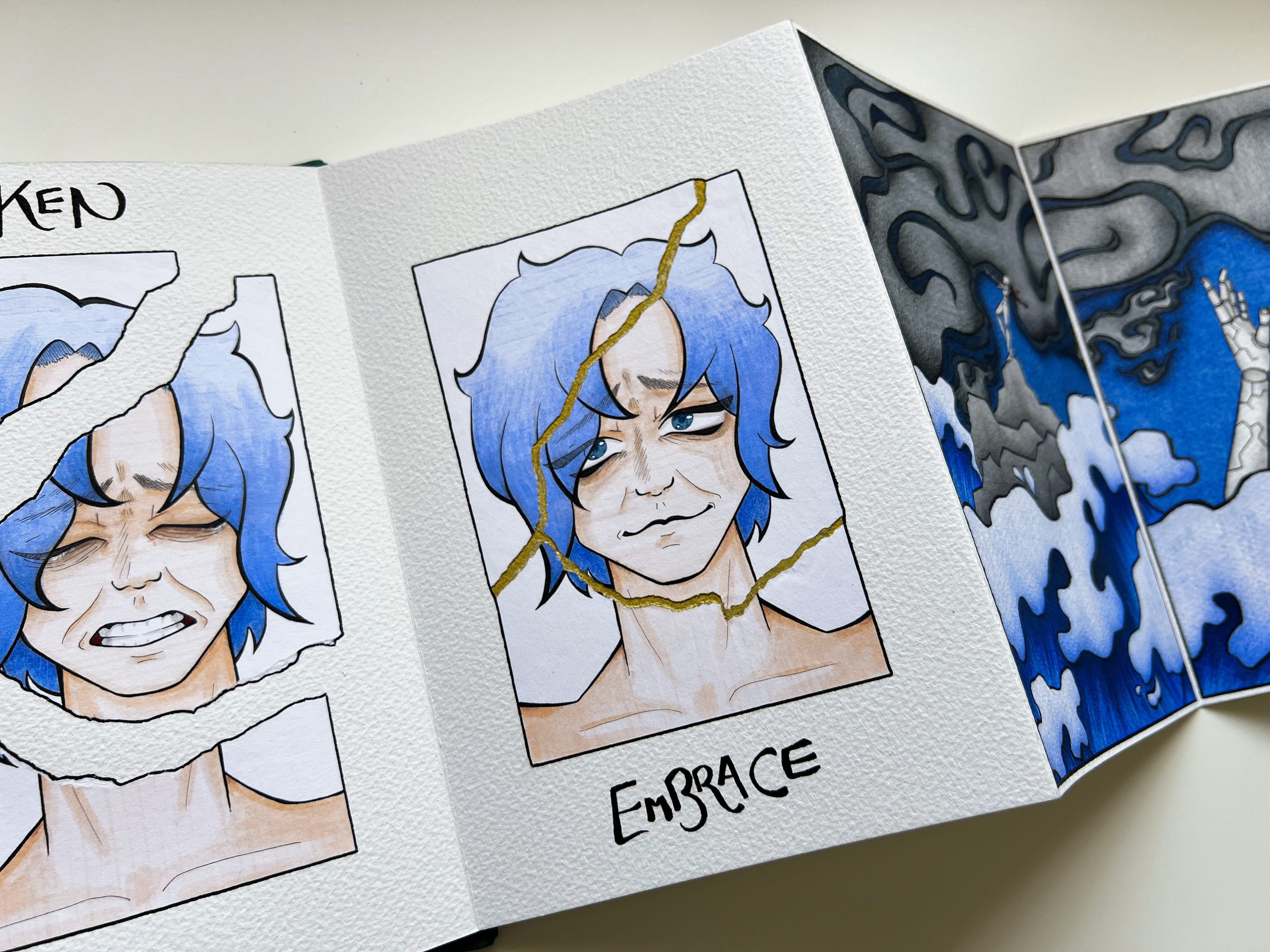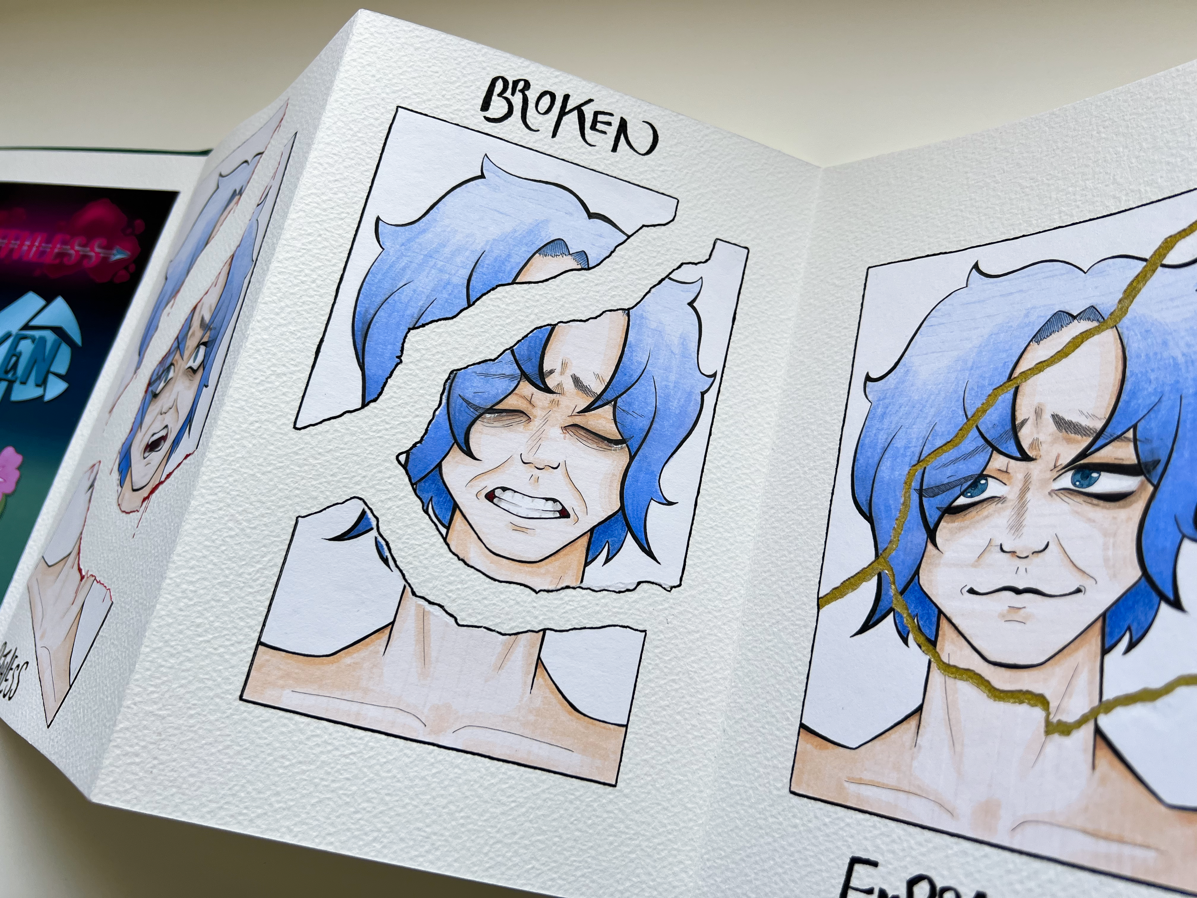 A collection of narrative illustrations based around the words Ruthless, Broken and Embrace. I wanted to try doing something that was a bit deeper than a comic, and tackle something that was more abstract than I am used to doing. So I chose some evocative words that I felt had a relationship, and spun a narrative around them in a concertina book.